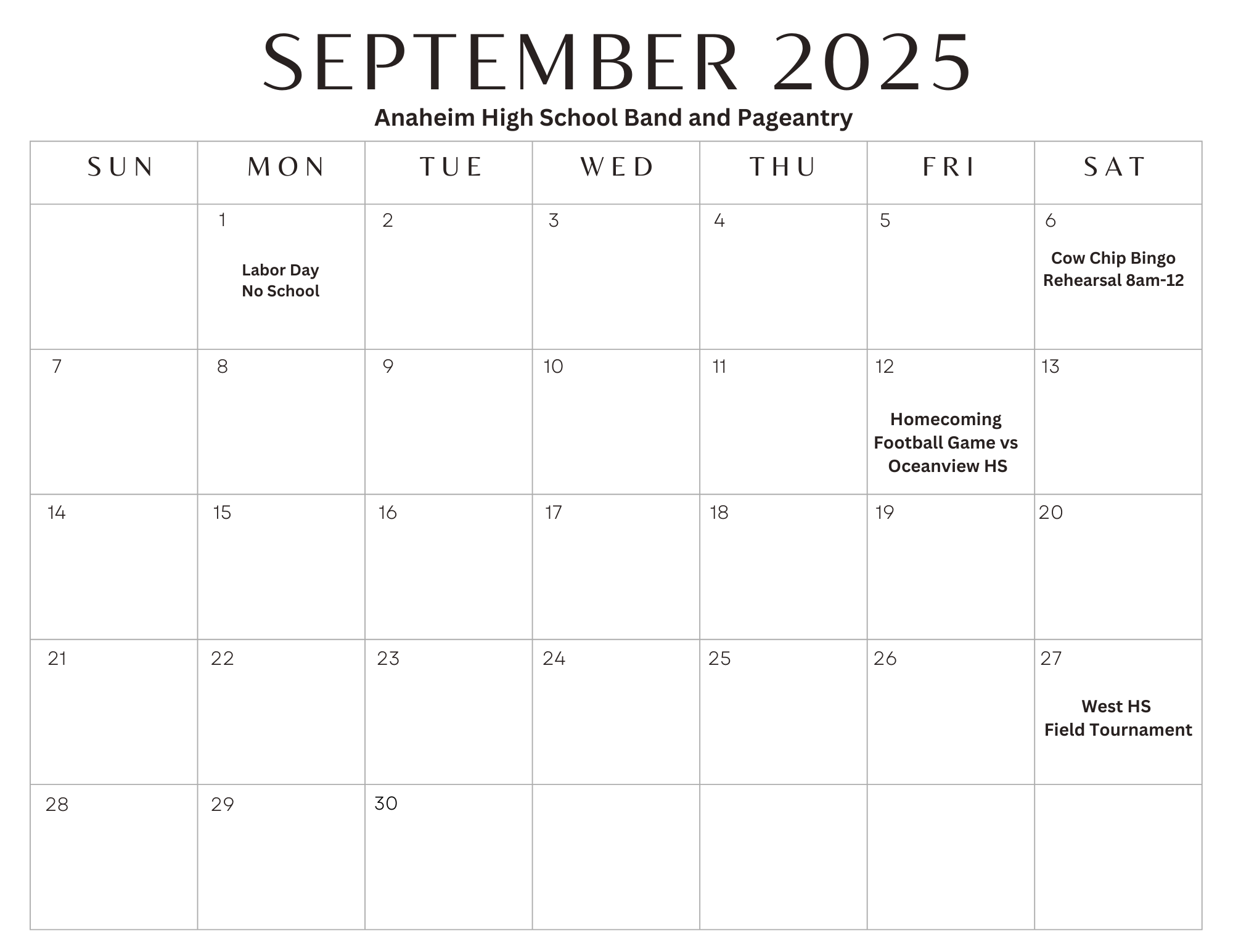 Calendar of events: